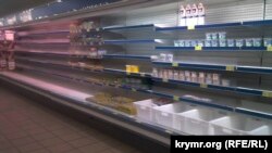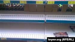 ​Полупустыми стоят прилавки с питьевой водой, маринадами и овощными консервами, кондитерскими изделиями. Редеют полки с товарами в отделах бытовой химии и гастрономии, - сообщает корреспондент Крым.Реалии.