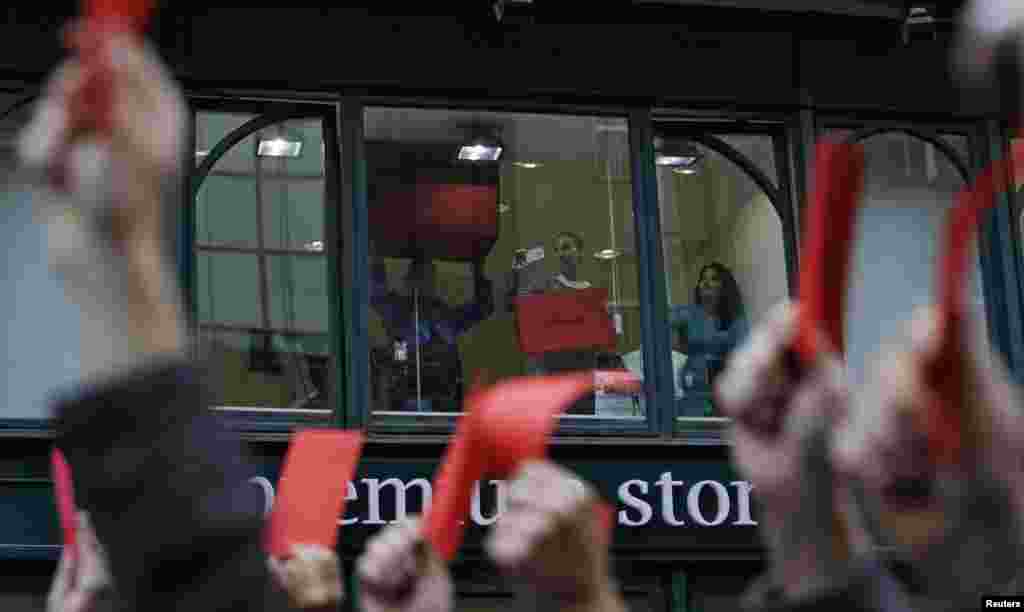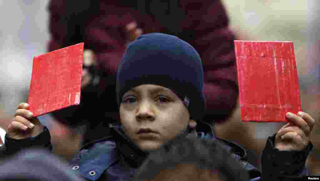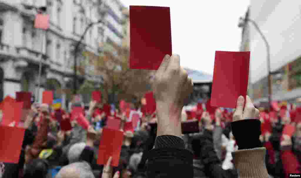 Czech Republic -- Protesters show symbolical red cards during a prostest against Czech President Milos Zeman in Prague, Czech Republic 17 November 2014.