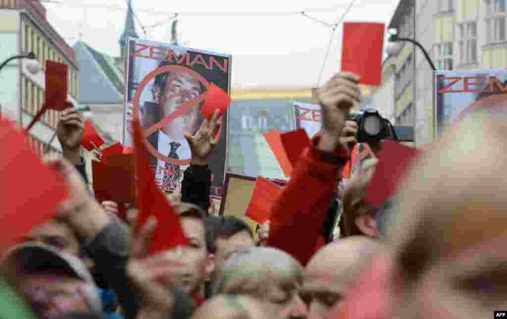 Тисячі чехів підняли символічні «червоні картки» президентові Чехії Мілошеві Земану. Акція протесту в центрі Праги 17 листопада, в день 25-ї річниці початку Оксамитової революції, зібралася на протест проти проросійської позиції Земана, який критикує Євросоюз за санкції проти Росії, закликає примиритися з анексією Криму і не надавати Україні економічної допомоги, бо там «триває громадянська війна». Додатковою причиною стало використання Земаном грубої лайки у традиційному президентському радіоінтерв’ю.