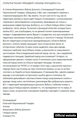 В обращении к Порошенко Козицин «исторически обосновал» претензии донских казаков на земли Донбасса и даже сравнил казачество с многострадальным еврейским народом: «Часть земель Луганской и Донецкой областей, которые были заняты ВСУ, уже освобождена, но на данный момент военизированные отряды и подразделения армии Вашего государства все еще находятся на территории населенных пунктов Донбасса, в частности в Станице Луганской. Все эти территории исторически принадлежали к области Войска Донского, поэтому казаки защищают свои исторические земли. В исторических событиях 20-го века можно выделить только два народа, которые подверглись наиболее масштабным потерям, в результате их умышленного уничтожения. Многострадальный казачий народ, так же, как и еврейский, подвергался геноциду»...