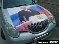 Ярые фанаты Путина пошли дальше. Один из автомобилистов «посадил» президента на капот своей машины. Путин здесь запечатлен во время президентской присяги. Он стоит на кремлевской трибуне с гербом, держит руку на конституции. Сзади развевается триколор. Машина патриота, правда, не российского производства.