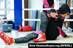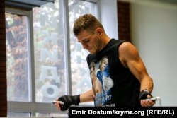 В это время Александр Усик разминается перед рингом: сначала он делает растяжку, затем висит на турнике. Несколько молодых людей, пользуясь случаем, просят крымчанина сфотографироваться с ними. Открытые тренировки Усика перед ответственным поединком уже стали доброй традицией.