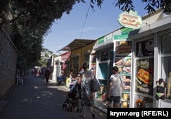 У пляжа, как и у всякой уважающей себя автономии, есть свои торговые ряды. Магазинчики построены на набережной, между домами, имевшими некогда вид на море и собственно пляжем. Набережную, как и саму Ялту, проектировали полтора века назад настоящие архитекторы, которые строили не здание, а город. И рынок легко поместился на том участке земли, который позиционировался, вообще то, как пешеходная дорожка.