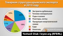 Изменилась и товарная структура крымского экспорта, первую пятерку позиций которого в украинскую бытность составляли дубильные экстракты (30%), минеральное топливо и продукты нефтеперегонки (25%), руды и шлаки (17%), котлы и машины (14%), а также продукты неорганической химии (14%).