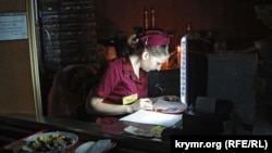 А это отдельный сюжет. То, что в ресторанах Симферополя поневоле ужинают при свечах, экзотичным не выглядит, романтика как-никак, хоть и вынужденная. А вот мистически освещенный фаст-фуд – это уже некий сюрреализм. Причем все остальное выглядит как и полагается в урбанистическом заведении. Столовая «У мамы».