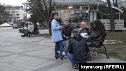 Молодежь (в том числе и крымские татары, судя по хиджабу девушки) чинно беседует.