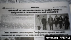 А в продолжение той церемонии вручения на 10-й полосе отдельная статья с заголовком «В администрации города Симферополя состоялось очередное оперативно-хозяйственное совещание под руководством главы городской администрации Геннадия Бахарева». И почти половину статьи составляет перечисление чиновников, которые при этом присутствовали.