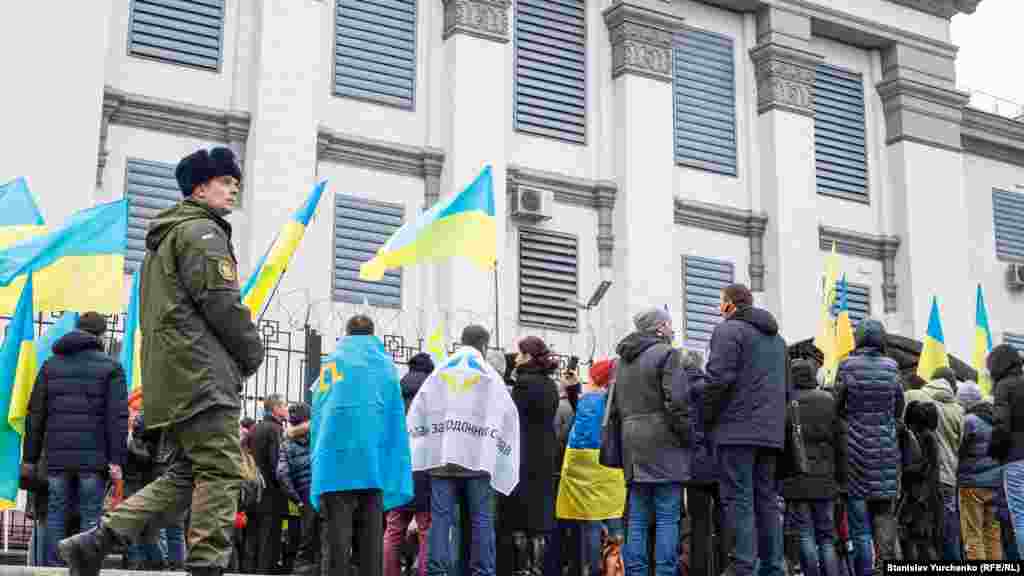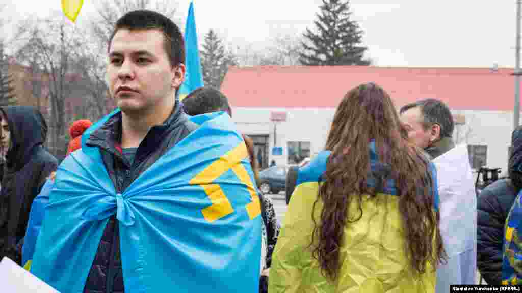 В руках у собравшихся плакаты с надписями: «Стоп геноциду крымских татар», «Нет репрессиям, обыскам, арестам», «Поява політв’язнів – крок у радянське минуле» и другие.
