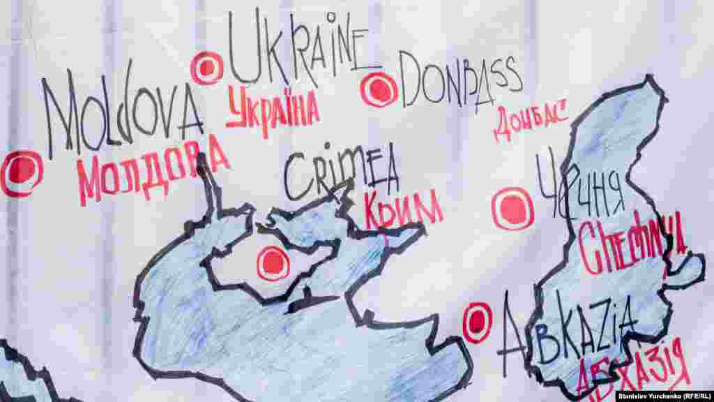 У забора российского посольства были выложены портреты крымчан, которые находятся в тюрьмах на территории аннексированного Россией Крыма, а также пропавших без вести крымчане.