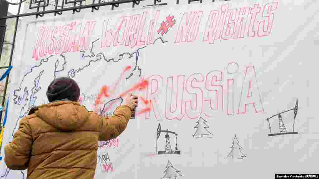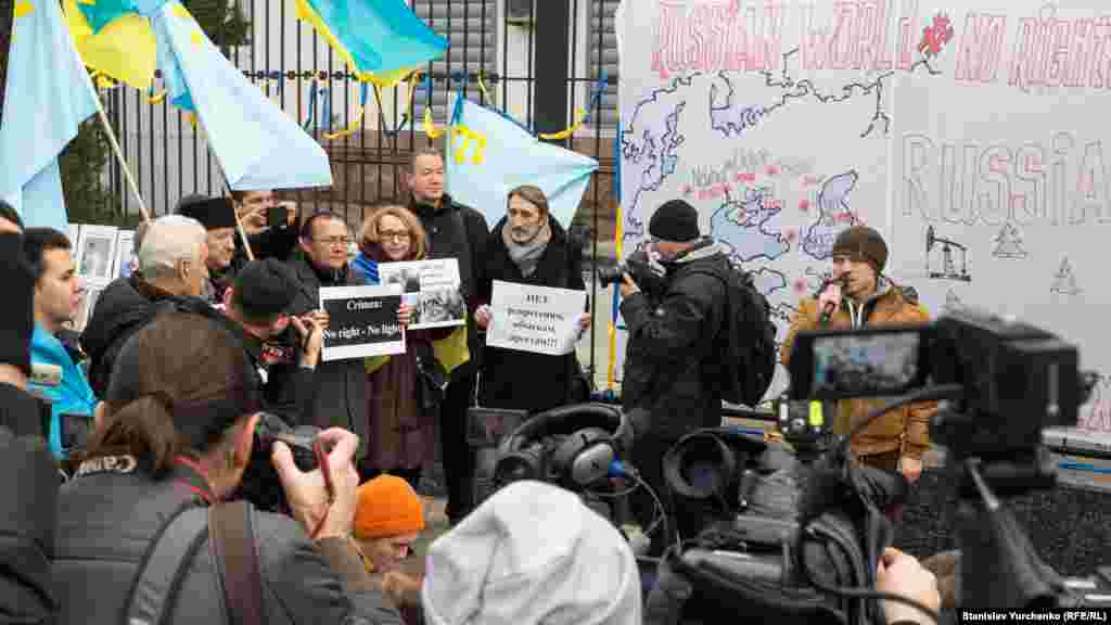 У посольства Российской Федерации в Киеве 10 декабря прошел митинг к международному Дню защиты прав человека. В мероприятии приняли участие несколько десятков человек, среди них члены Меджлиса крымскотатарского народа, правозащитники, переселенцы из Крыма и Донбасса. Активисты требовали прекратить нарушения прав человека в Крыму.