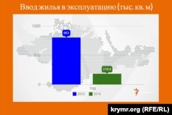 Несмотря на масштабные стройки по всему полуострову, уровень ввода жилья в эксплуатацию в оккупированном Крыму упал в несколько раз. В частности, по данным Крымстата, с января по ноябрь 2015 года на полуострове ввели в строй 218,9 тыс. кв. м жилья. В то же время в 2013 году этот показатель составил 963 тыс. кв. м, что в 4.3 раза превышает масштабы строительства оккупантов.