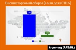 Ситуация в сфере внешней торговле сложилась еще более пессимистичная: внешнеторговый оборот полуострова сократился почти в 10 раз – с 1,76 млрд долларов США за январь-октябрь 2013 года до 166,8 млн долларов США за аналогичный период 2015 года.