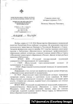 Интернет-журнал «7x7» направил официальный запрос в Министерство образования и молодежной политики Коми после того, какв середине декабря 2015 года стало известно, что из библиотек и учебных заведений республики изымают литературу, изданную при поддержке Фонда Сороса.
