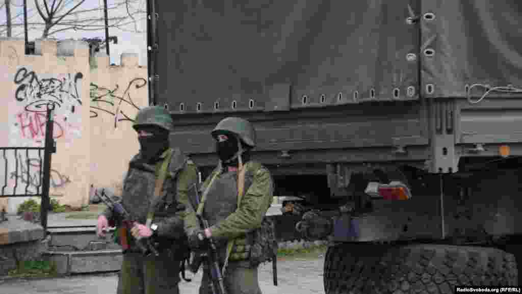 Ко второй годовщине российской аннексии украинского полуострова Крым.Реалии публикуют архивные фото, на которых видно, как проходила оккупация Крыма и как его жители ей сопротивлялись. 4 марта 2014 года. Вооруженные российские военные продолжают находиться на улицах Симферополя. В частности, два автомобиля и около 60 военнослужащих из автоматами и ручными пулеметами находятся на тротуаре и во дворе жилого дома на улице Карла Маркса в центре города. Они стоят в 50 метрах от КПП штаба Войск береговой охраны ВМС Украины. Российские военные не вступают в контакт с местным населением. На вопрос журналистов, когда домой - не отвечают, во время фотографирования поворачиваются спиной.