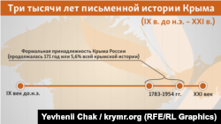 Таким образом, суммарно Петербург и Москва владели Крымом с 1783-го по 1954-й, т.е. 171 год, а фактически, с учетом двух оккупаций – еще на 3,5 года меньше. Итак, из трех тысяч лет письменной истории Крыма (ІХ в. до н.э. – ХХІ в.) его формальная принадлежность России продолжалась 171 год или 5,6% всей крымской истории.
