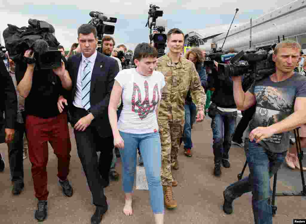 Около 15 часов 25 мая самолет, на борту которого находилась Надежда Савченко, приземлился в Украине. Надежду Савченко обменяли на военных ГРУ России Александра Александрова и Евгения Ерофеева, которые также уже вернулись в свою страну. Указ об их помиловании был опубликован на сайте президента Украины. На сайте Кремля также опубликован указ о помиловании Савченко. По официальной информации, о ее помиловании просили родственники погибших журналистов ВГТРК.