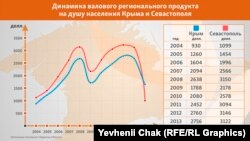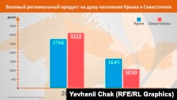 Рассмотрим подробнее год до и после аннексии. Итак, по данным Госкомстата Украины, в 2013 году ВРП на душу населения АРК составлял 22,6 тыс. гривен (или 2756 долл. по тогдашнему среднему курсу), Севастополя – 25,6 тыс. гривен (3122 долл.).