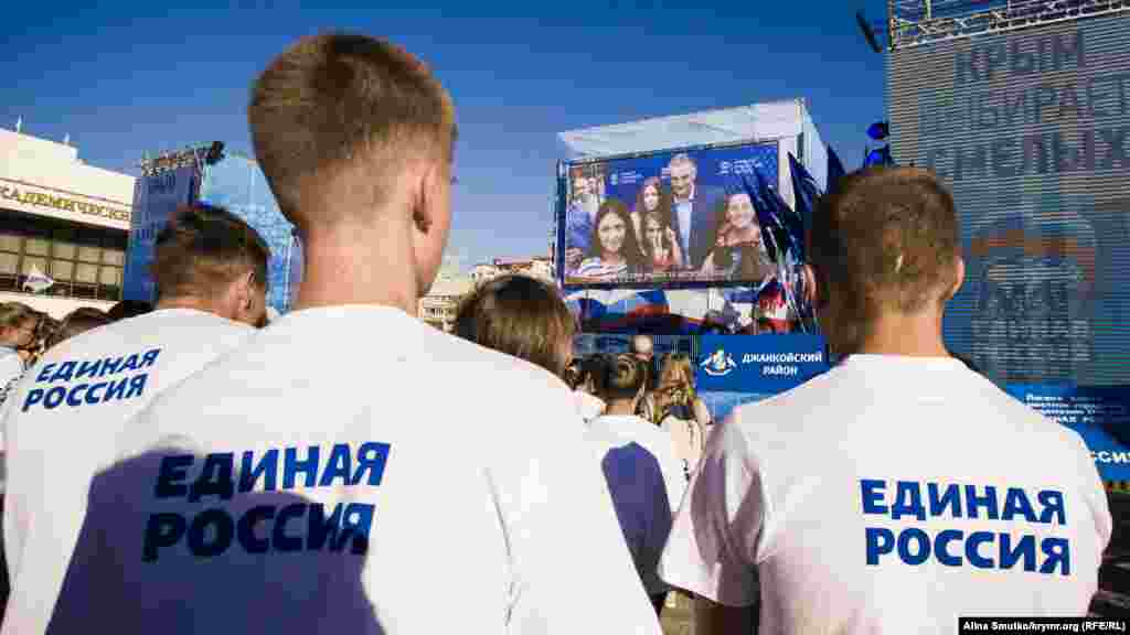 В предверии выборов в Государственную Думу России на территории Крыма, которые Украина признала нелигитимными, на площади Ленина в Симферополе проводят концерт под флагами партии «Единая Россия». На подходе к сцене стоят рамки металлоискателей, территория проведения концерта оцеплена, прилегающие к площади улицы перекрыты.