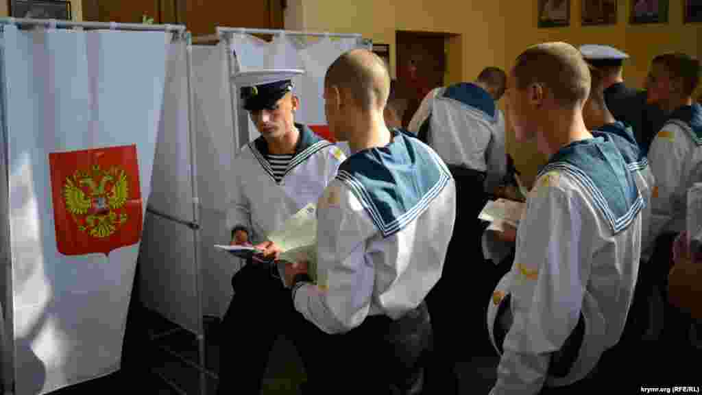На избирательный участок №80 «Театр юного зрителя» в Севастополе курсанты шли колоннами в сопровождении своих непосредственных начальников