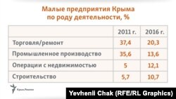 В 2016 году хозяйственные приоритеты крымчан изменились. В частности, доля торговли/ремонта сократилась до 20,3%, промышленности – до 13,6%. При этом возросло число малых предприятий в сфере операций с недвижимостью – с 5 до 12,1%, строительстве – с 5,7 до 10,7%.