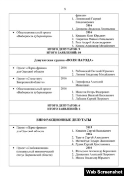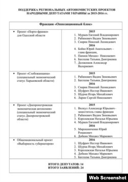 Украинские СМИ в четверг опубликовали документ из так называемого взломанного почтового ящика советника президента России Владислава Суркова. В нем, в частности, анализируют, сколько украинских депутатов поддержали различные «автономистские» проекты в 2015-2016 годах. Первый в списке ‒ «Порто-франко». А дальше: проект «спецстатуса Запорожской области», проект «Днепропетровская экономическая автономия», проект «Слобожанщина».