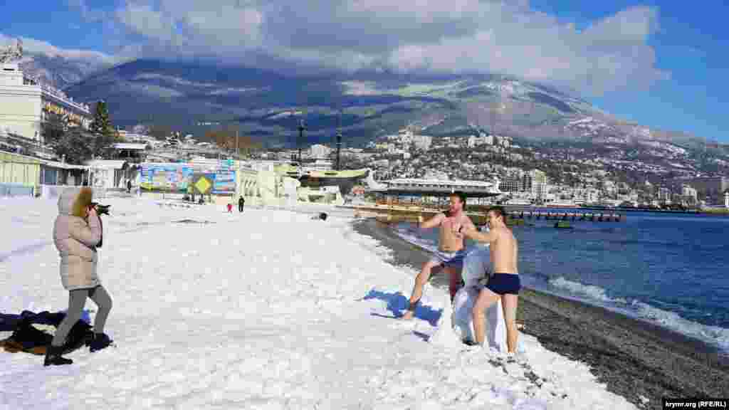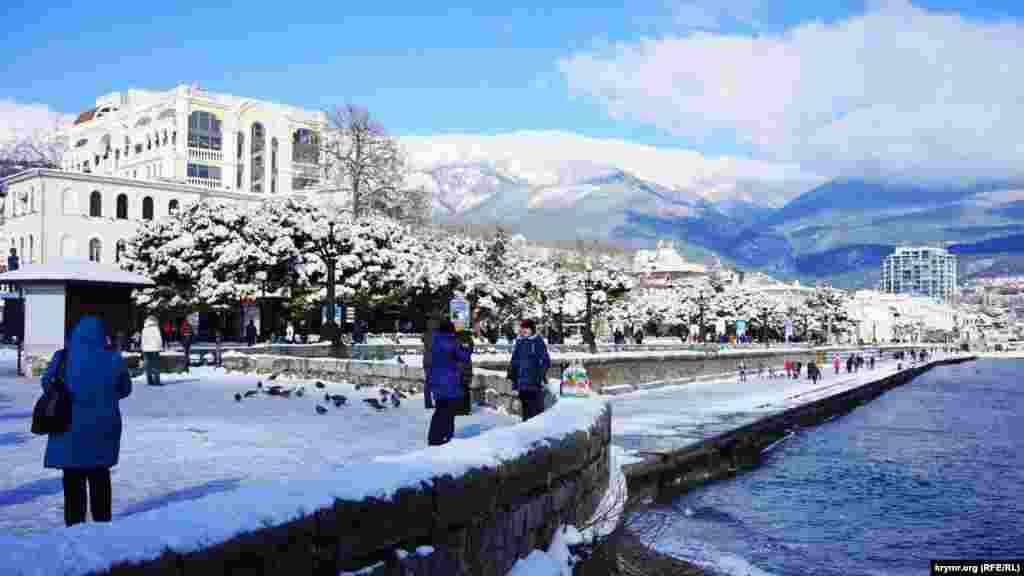 В пятницу 27 января в Ялте выпала треть месячной нормы осадков: весь город покрыло толстым шаром снега. Сильный снегопад привел к пробкам и ДТП на автодорогах. Последствия снегопада ликвидируют до сих пор, поэтому российские власти Ялты просят граждан воздержаться от поездок на машинах без острой необходимости. Виды заснеженной Ялты – в фотогалерее Крым.Реалии.