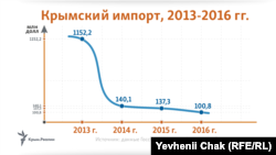 Сокращение импорта в Крым также приобрело катастрофические размеры: если в 2013 году на полуостров ввезли товаров на сумму в $1,2 млрд, то в 2016 году весь импорт едва достиг 100 млн долл.
