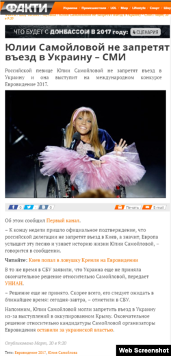 В воскресенье российские и украинские СМИ со ссылкой на «Первый российский» телеканал сообщили о том, что певице Юлии Самойловой не запретили въезжать на территорию Украины. А значит – она сможет представили Россию на песенном конкурсе «Евровидение-2017». Однако в СБУ такую информацию опровергли.
