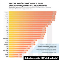 Национальный совет по вопросам телевидения и радиовещания еще в марте мониторил украинские телеканалы на предмет того, сколько украиноязычного контента они транслируют. Тогда «антилидером» были «Интер» и «Украина» – по 26%, К2 – 36%, «Enter фильм» – 39%.