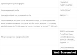 По данным российского реестра юрлиц, фирма зарегистрирована в Симферополе по улице Киевской, 187-в. В этом же здании размещаются дилерские автоцентры, в том числе Peugeot и Hyundai.