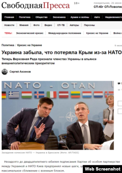 Незаконную аннексию Крыма СМИ объяснили расширением НАТО – «несмотря на то, что именно Россия установила контроль над полуостровом и это нарушение международного права не имеет никакого отношения к НАТО», отмечают авторы обзора.