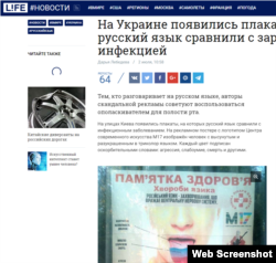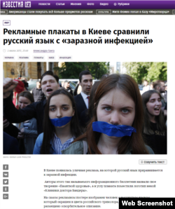 Так, канал Минобороны России со ссылкой на сайт газеты «Вести», выходящей в Украине, отмечает: «На улицах украинской столицы появилась реклама, которая агитирует отказаться от «русского языка», сравнивая его с инфекцией. Снимками, на которых изображены ситилайты со скандальными надписями, делятся пользователи социальных сетей. На плакате представлен человек с высунутым языком, который разделен на три секции и раскрашен в разные цвета. Секции подписаны словами: империализм, агрессия, война, сепаратизм и смерть».