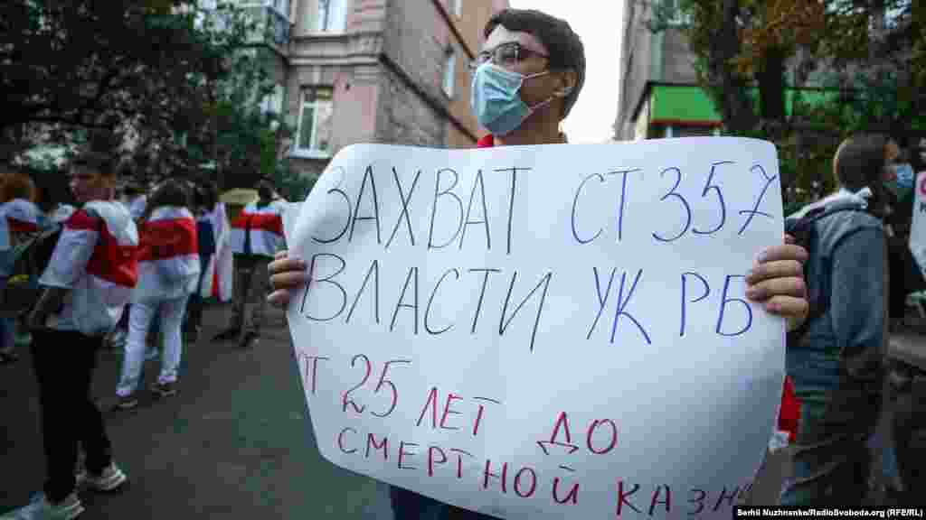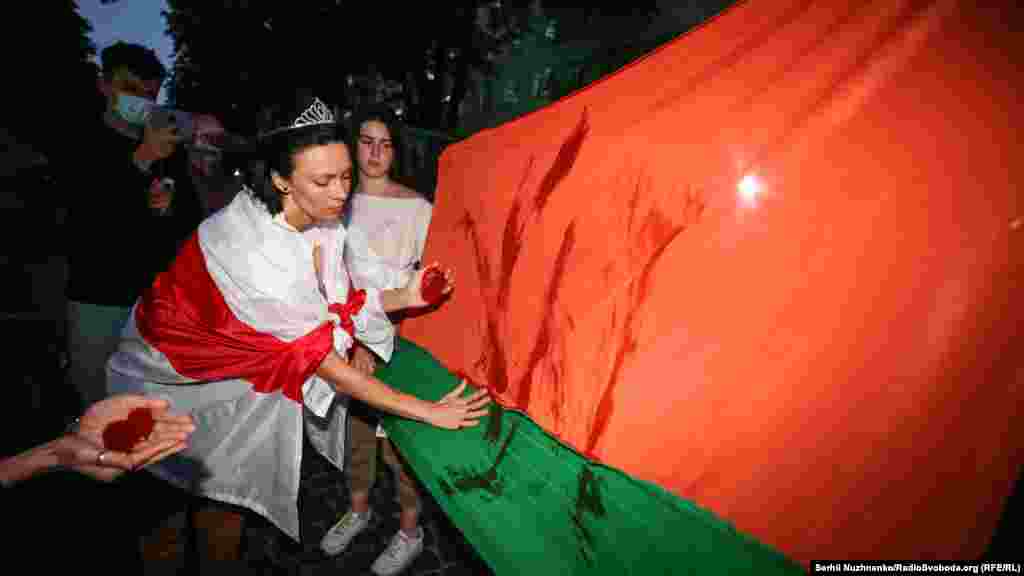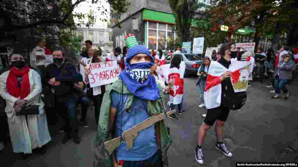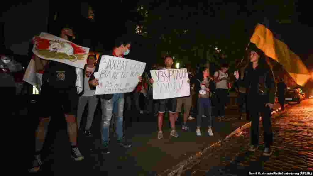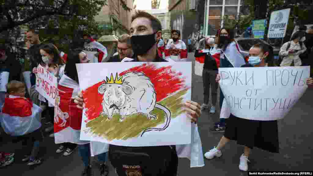 Кілька десятків білорусів зібралися у середу ввечері під стінами посольства Білорусі в Києві. Вони протестували проти таємної інавгурації Олександра Лукашенка, яка відбулася 23 вересня, та висловлювали свою солідарність протестувальникам у Білорусі. Учасники акції тримали прапори та плакати, скандували «Живє Бєларусь», «Йди» і «Лукашенко в автозак». Також «кровью» вимазали прапор Білорусі і зіграли перформанс «інавгурація Лукашенка».