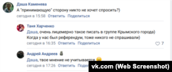 В пабликах «самого патриотичного города мира», как его называют севастопольцы, тоже обсуждают новости. Так, в сообществе «Северная сторона Севастополя» Даша Каменева интересуется, не хотят ли спросить «принимающую сторону», имея в виду Россию, к которой якобы хотят присоединиться оккупированные украинские территории.