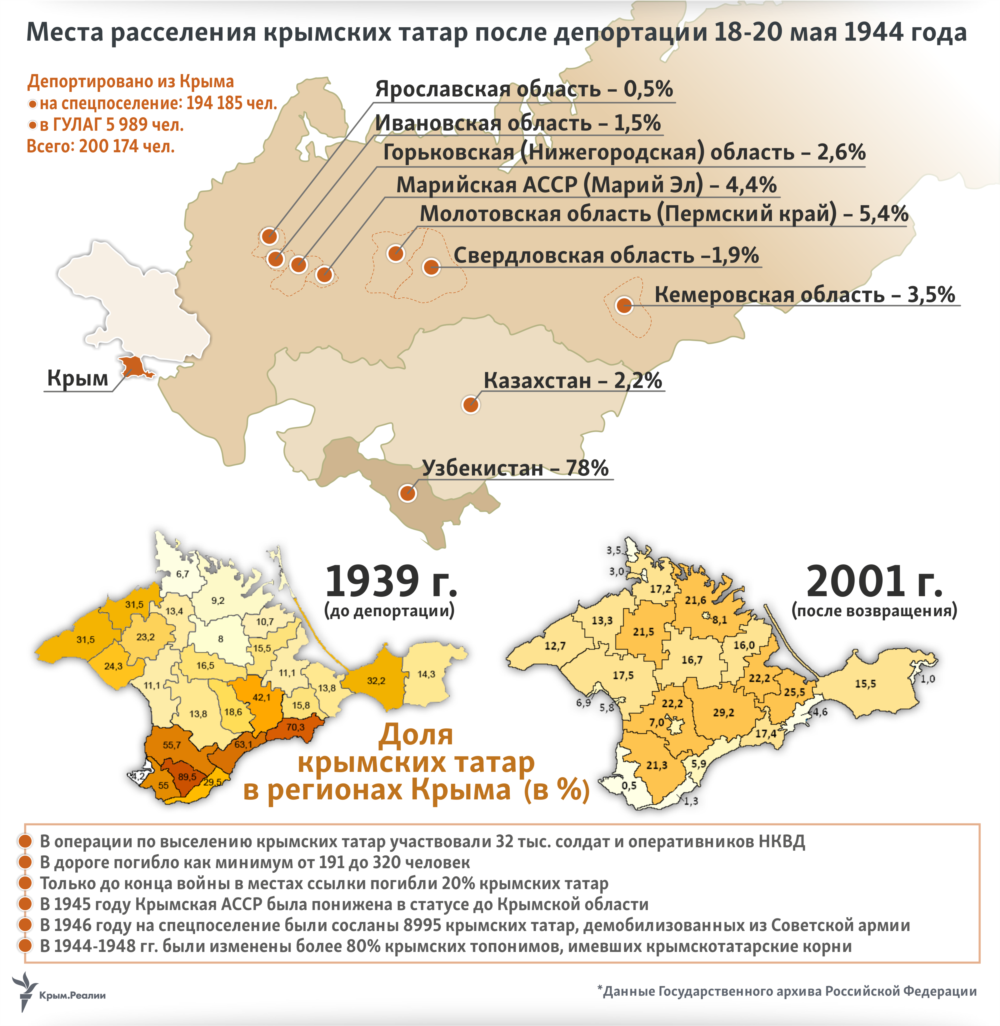 11 мая 1944 г. Сталин подписал постановление Государственного Комитета Обороны № 5859сс об организации депортации крымских татар. Основная фаза спецоперации началась еще до рассвета 18 мая и завершилась к вечеру 20 мая. Оставшихся крымских татар выселили во время последующей депортации армян, болгар и греков 27-28 июня 1944 г. Немногочисленных вернувшихся из мест спецпоселений повторно изгоняли за пределы полуострова до конца 60-х гг.