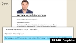 Когда журналисты решили ознакомиться с полным трудовым путем Андрея Богдана до назначения в ОП, оказалось, что его официальной биографии в открытых источниках нет. Лишь на третий запрос Офис президента направил ее «Схемам». После чего ее, наконец-то, опубликовали и на официальном сайте президента Зеленского.