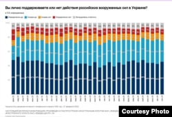 Аналитический центр Юрия Левады почти каждый месяц, начиная с марта 2022 года, исследует отношение россиян к войне России против Украины. Последний общероссийский опрос по репрезентативной всероссийской выборке городского и сельского населения в 50 субъектах РФ прошел с 26 сентября по 2 октября, пишет Радио Свобода.
