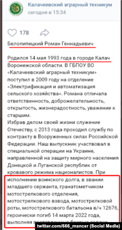 Гранатометчик Роман Белолипецкий из Воронежской области был убит 14 марта. После попадания некролога в украинские блоги, опубликовавший его Калачеевский аграрный техникум удалил запись со своей страницы в соцсети ВКонтакте.