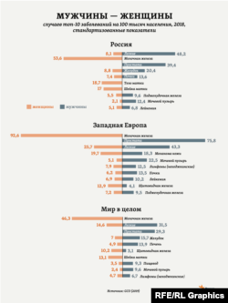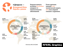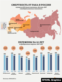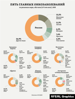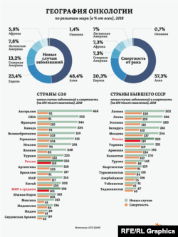Раковые заболевания считаются второй из основных причин смерти в мире. В 2018 году от онкологии, согласно данным Всемирной организации здравоохранения (ВОЗ), умерли 9,6 миллиона человек. Россия находится на пятом месте по числу смертей от раковых заболеваний. Еще хуже дело обстоит в Китае, Индии, США и Японии. Меньше всего от рака умирают в Новой Зеландии. Все эти данные представлены в материале проекта Радио Свобода "Фактограф".