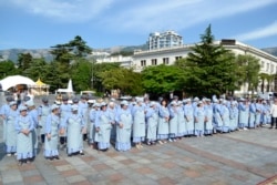 На городской набережной Ялты к «присяге» привели местных дворников. Работники давали «клятву чистоте» в новой, специально пошитой спецодежде, стилизованной в русском стиле ХIX века.