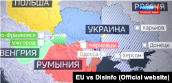 В ток-шоу «60 минут», которое транслируется на российском канале, быстрым движением камера «зумится» в карту Украины. Ведущий шоу объясняет, что украинскими территориями якобы занимаются страны-члены ЕС: Румыния, Польша, Венгрия. «Эгоцентрическая украинскость Киева уже расколола страну», ‒ интенсивно объясняет ведущий.