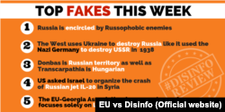 Авторы обзора отмечают такие фейки: что якобы Запад использует Украину для уничтожения России так же, как использовал нацистскую Германию для уничтожения СССР; что Киев саботирует работу Минской трехсторонней группы; а сбитый российский самолет Ил-20 в Сирии был актом агрессии против Сирии, организованным США.