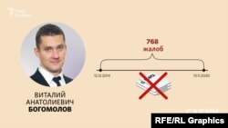 - Виталий Богомолов, который начал и закончил подавать жалобы в Европейский суд буквально одновременно с Малаховым, имеет 768 жалоб за аналогичный период, из которых не менее пяти суд уже отклонил.