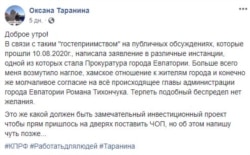 Депутат российского горсовета Евпатории Оксана Таранина на своей странице в Фейсбуке после прошедших слушаний сообщила, что «терпеть подобный беспредел нет желания», и опубликовала копии жалоб в различные инстанции, в том числе в прокуратуру.