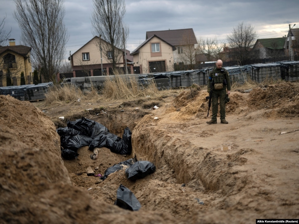На снимке от 6 апреля украинский военный стоит у братской могилы с телами мирных жителей, погибших во время оккупации Бучи