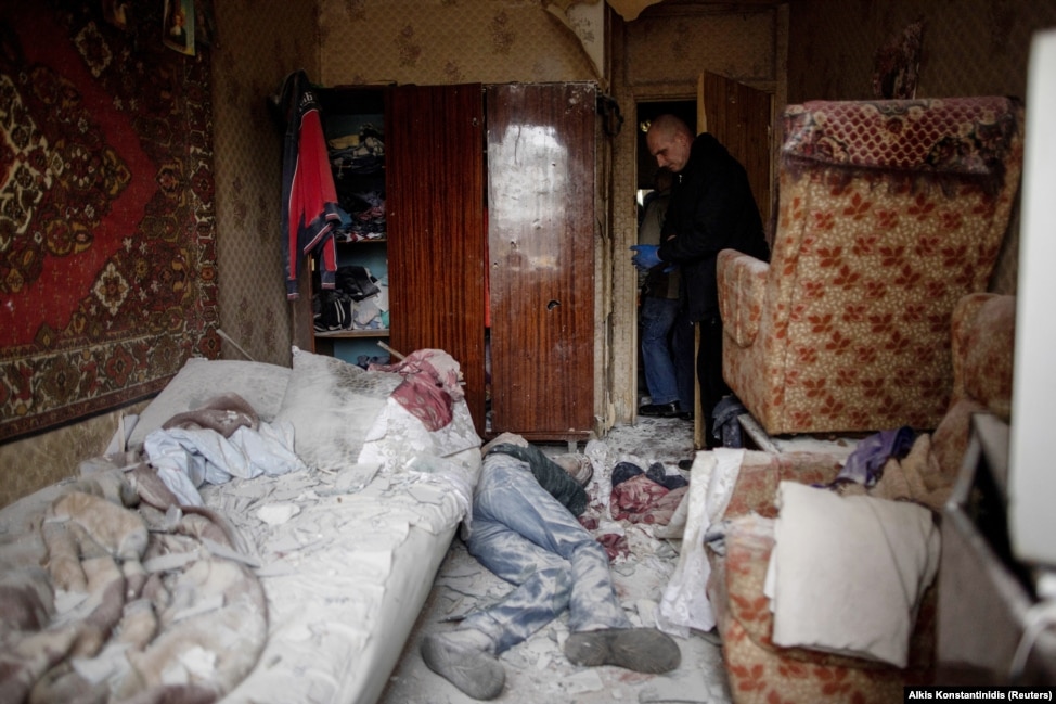 Представитель ГСЧС Украины стоит над телом 41-летнего жителя, погибшего в своей квартире в результате российского обстрела. Харьков, 13 апреля 2022 года