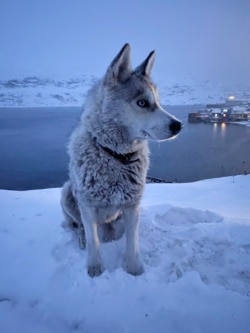 Собака породы хаски на улице Териберки. Фото сделано около полудня.