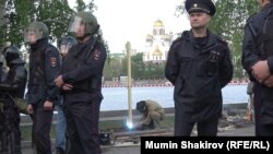 Утро третьего дня противостояния в городском сквере в российском Екатеринбурге началось со строительных работ. На оцепленной территории появилась бурильная техника, вагончики, рабочие-монтажники, сварщики и под надзором чоповцев и солдат Росгвардии началось возведение забора.