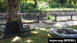 Замечено десять рабочих, которые были заняты разборкой и тщательной упаковкой чугунных оград