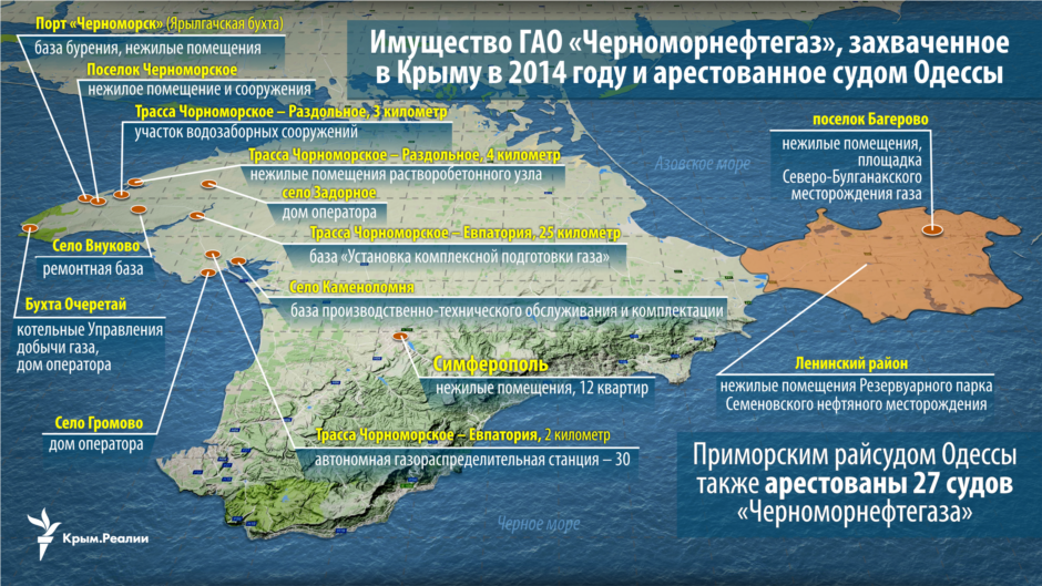 В июне 2017 года Приморский районный суд Одессы арестовал имущество «национализированного» в Крыму предприятия «Черноморнефтегаз», которое было захвачено во время российской аннексии полуострова в 2014 году. Активы и имущество предприятия третий год используются подконтрольными России компаниями для добычи нефти и газа на шельфе Черного моря, что является нарушением международного и украинского законодательства. В перечне арестованного – 60 объектов: от баз, складов и квартир до буровых вышек, которые сегодня охраняются вооруженными людьми и судами Черноморского флота России.